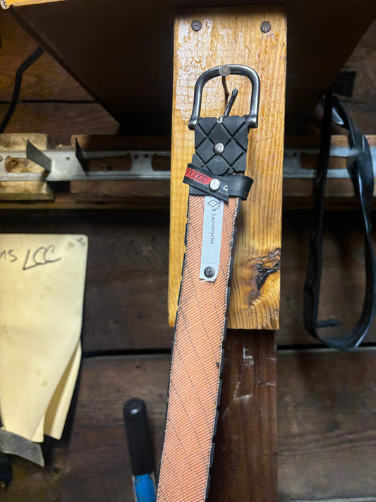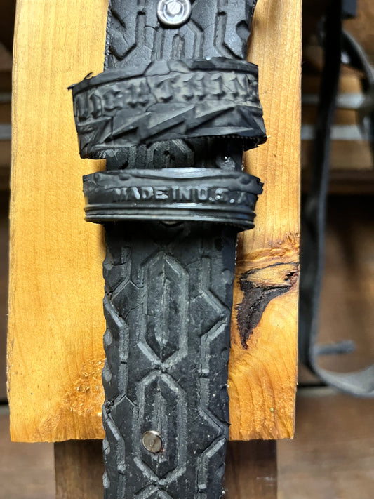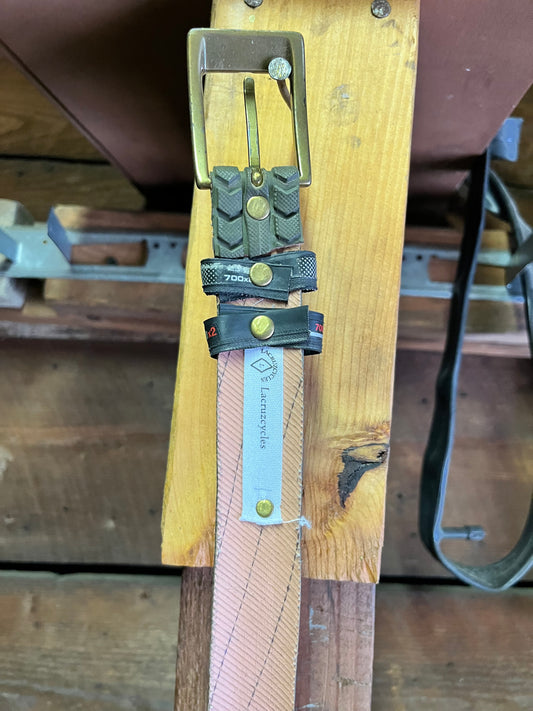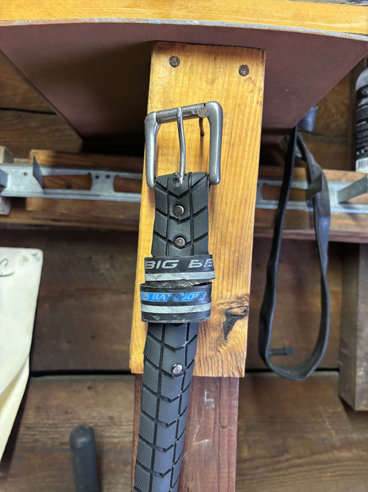 A visually striking image showcasing a fashionable belt made out of recycled bicycle tires.