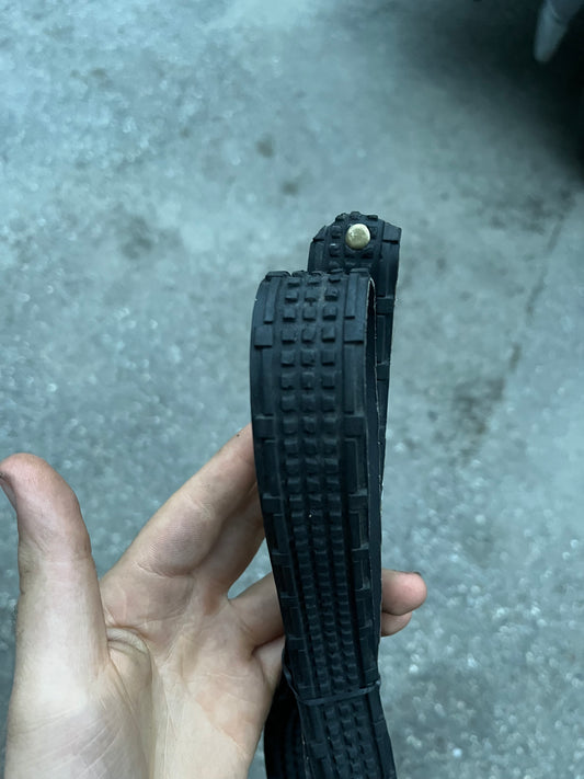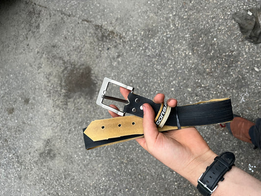A visually striking image showcasing a fashionable belt made out of recycled bicycle tires.