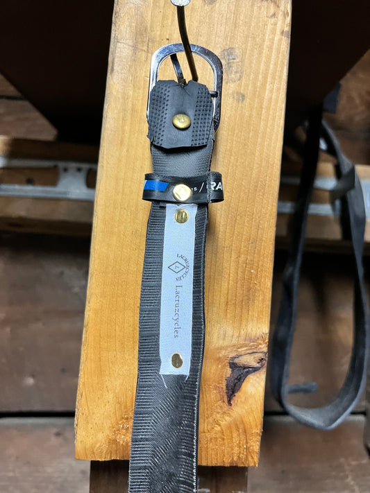 A visually striking image showcasing a fashionable belt made out of recycled bicycle tires.